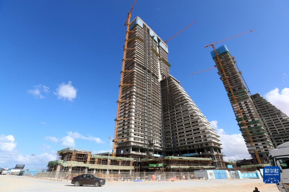 這是12月18日拍攝的埃及阿拉曼新城超高綜合體項目率先封頂的D01住宅樓(左)。
