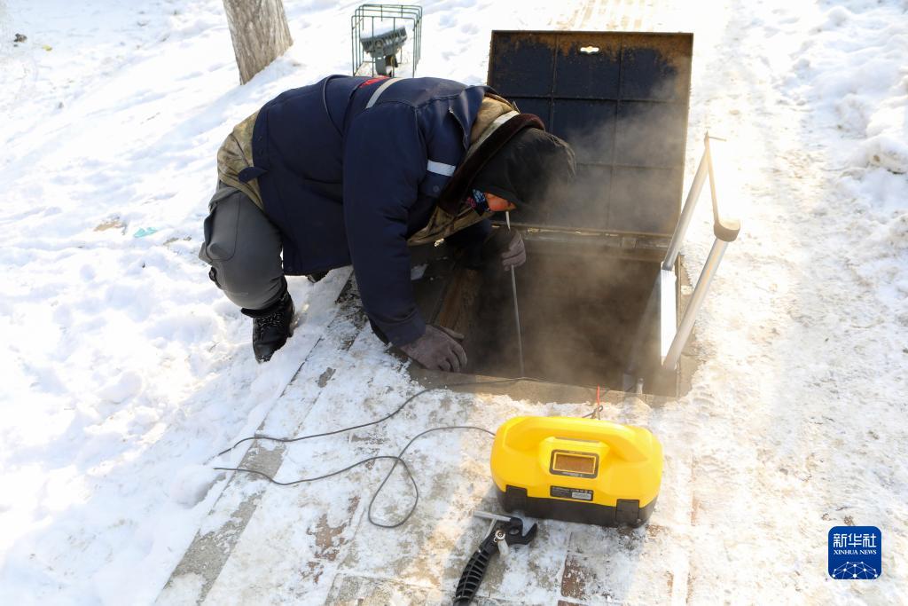 12月19日,瀋陽東泰熱源的工作人員在瀋陽市沈北新區一街道巡查供熱管網。