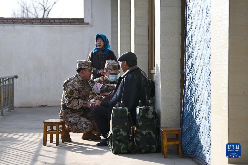 12月19日,武警青海總隊海東支隊衞生隊醫師在青海省海東市民和回族土族自治縣中川鄉草灘村開展醫療保障。