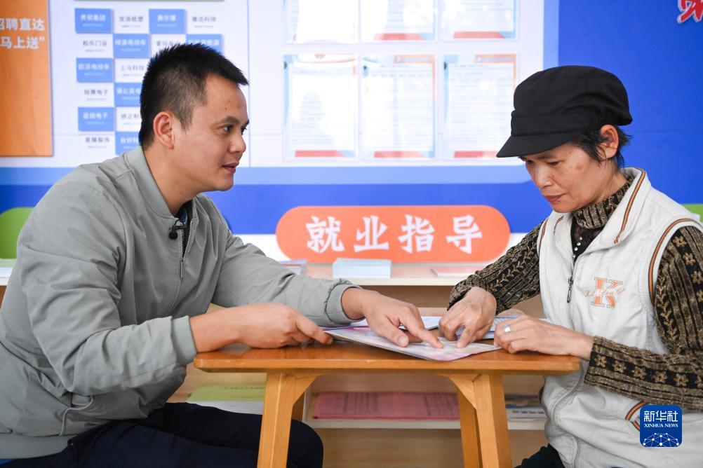 在廣西貴港市港北區一家“就業超市”,工作人員(左)為前來諮詢的群眾介紹招聘信息(2023年11月30日攝)。