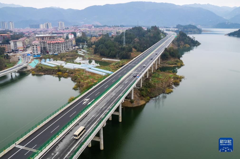 12月19日,車輛行駛在官新高速楊家灣大橋上(無人機照片)。