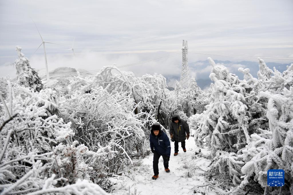 12月19日,尹斌(前)和龍昱君在110千伏西公線003號監測哨所觀測覆冰情況後返回。