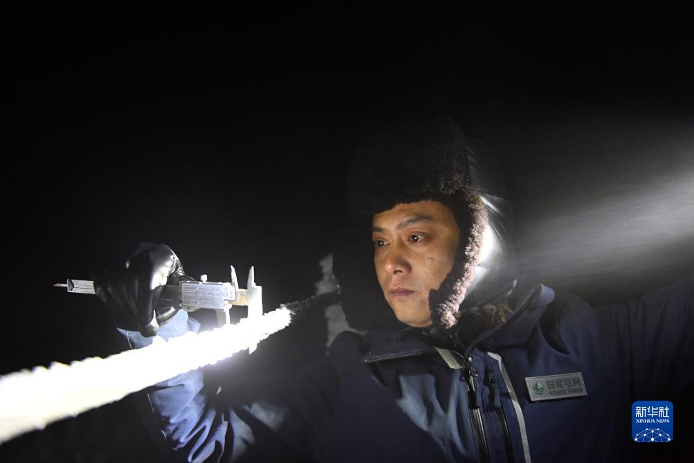 12月18日夜間,尹斌在110千伏西公線001號監視哨所用游標卡尺測量導線覆冰厚度。