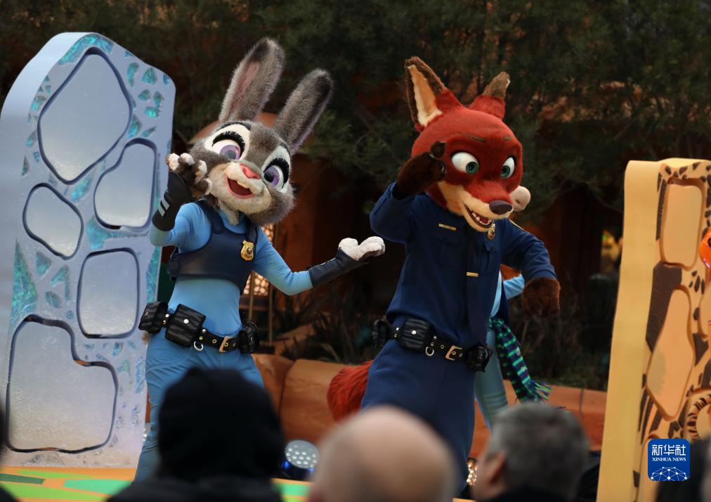 12月19日,在上海迪士尼樂園“瘋狂動物城”開“城”儀式上,“狐狸尼克”和“兔子警官朱迪”亮相。
