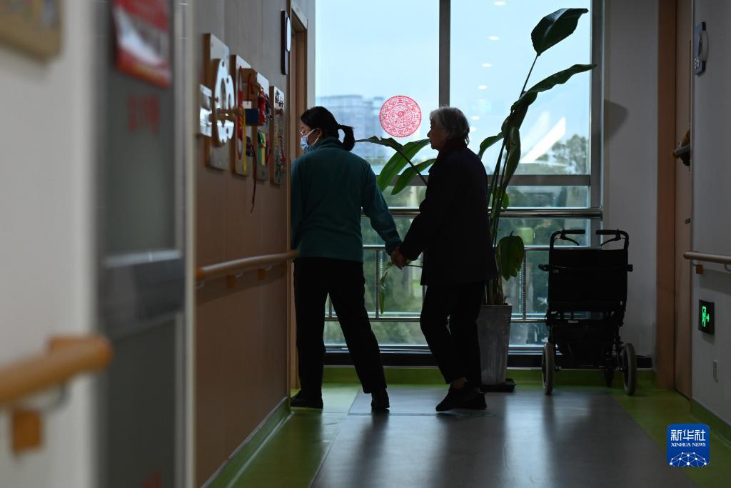 12月19日,在鎮海區蛟川街道樂齡長者之家,工作人員(左)牽着老人進入康復訓練室。