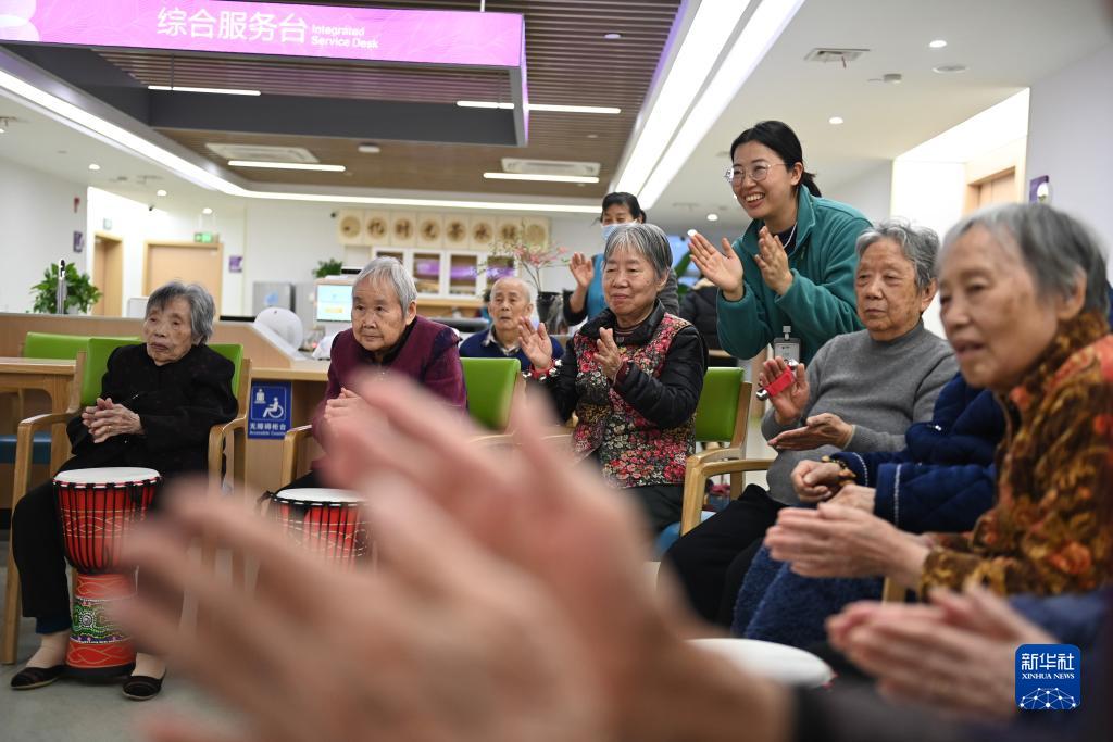 12月19日,在鎮海區蛟川街道樂齡長者之家,老人在工作人員的輔助下參加音樂康復訓練。