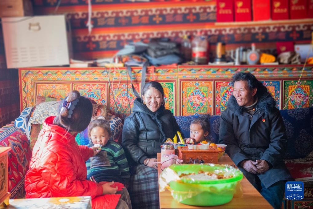 尼瑪縣尼瑪鎮魯根村村民嘎瑪熱傑一家(12月18日攝)。