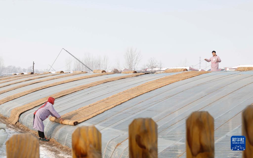 12月19日,河北省邢&市南和區賈宋鎮後寺上村農戶在為蔬菜大棚覆蓋保溫草簾。