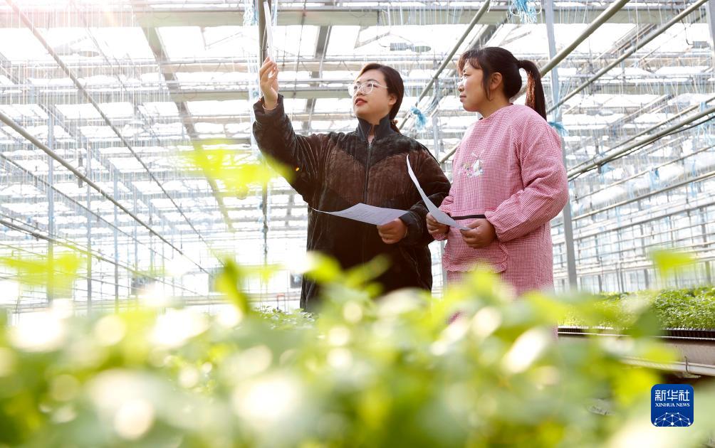 12月19日,氣象工作人員在河北省邢&市南和區賈宋鎮後寺上村指導農戶進行大棚蔬菜溫濕度管理。