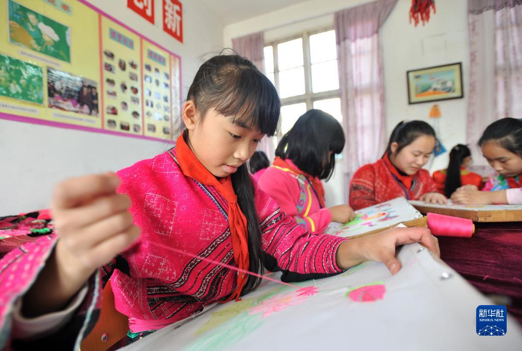 在龍勝各族自治縣泗水鄉,學生在課堂上學習紅瑤服飾刺繡技藝(2012年12月5日攝)。