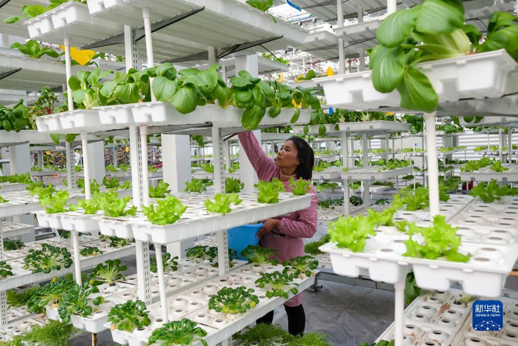 12月19日,工作人員在未來農業科技館的垂直農業展示區管護蔬菜。