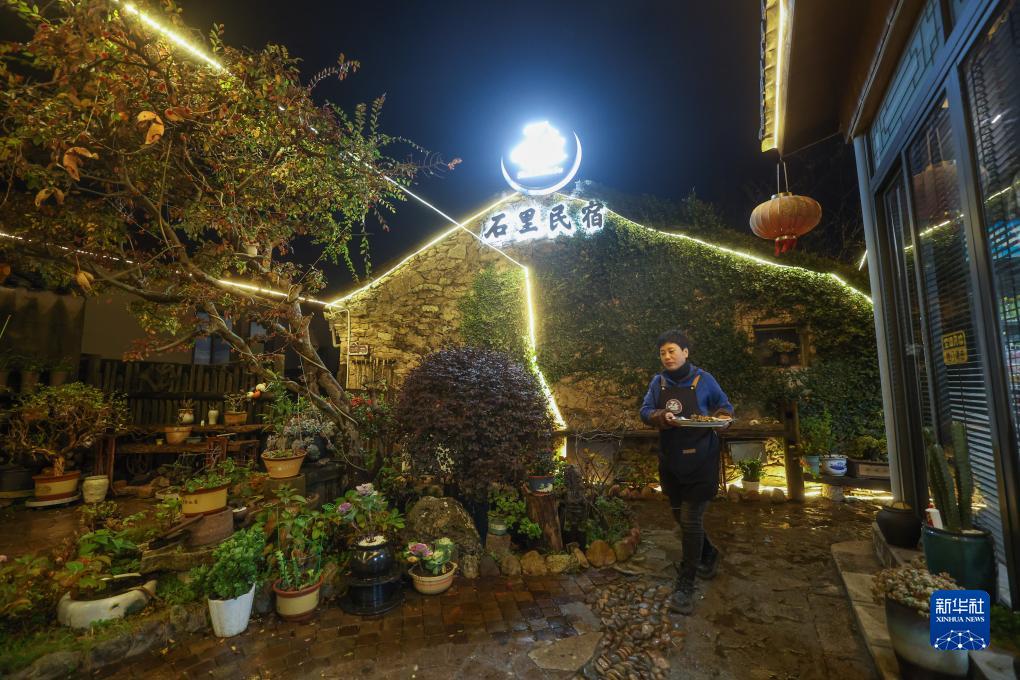 12月19日,雙合村石里民宿的民宿主張瑛準備給游客上菜。張瑛和丈夫王代明都是當地漁民,他們將老房子進行改造,成了當地的網紅民宿,吸引不少外地客人前來吃飯、住宿。