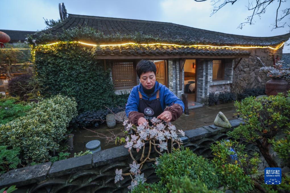 12月19日,雙合村石里民宿的民宿主張瑛在民宿院子裏整理盆景花卉。張瑛和丈夫王代明都是當地漁民,他們將老房子進行改造,成了當地的網紅民宿,吸引不少外地客人前來吃飯、住宿。