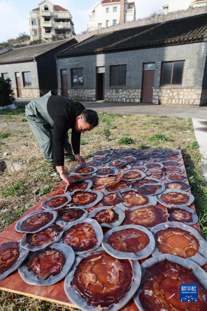 12月19日,雙合村石里民宿的民宿主王代明在腌制、晾曬海蜇。