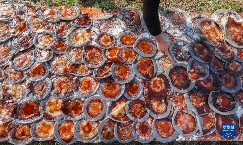 12月19日,雙合村石里民宿的民宿主王代明在腌制、晾曬海蜇。