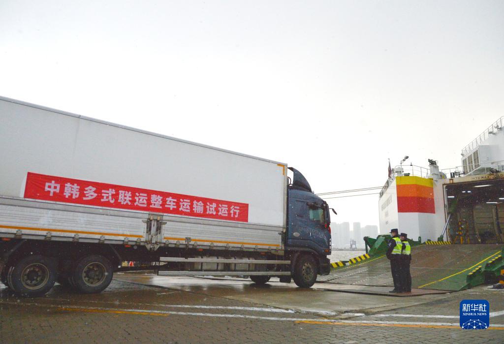 12月19日,中韓兩國在威海-仁川試運行多式聯運整車運輸,首輛承擔整車運輸任務的貨車滿載中國跨境電商貨品,在山東威海港登上客貨班輪,準備赴韓。