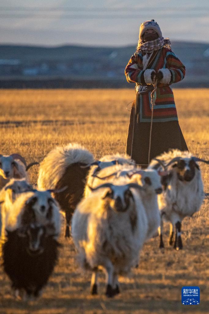 太陽落山,丹增趕着羊回圈(12月18日攝)。
