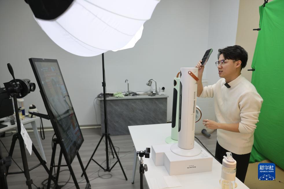12月20日,慈溪市觀海衛鎮一家取暖設備生産企業的主播在直播中推介相關産品。