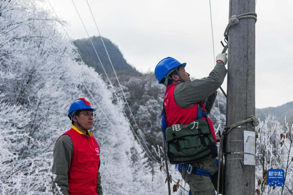 近日,湖北省神農架林區迎來低溫雨雪天氣,為保障輸電線路運行安全,國網神農架供電公司運維人員迎着風雪巡線、排查、檢修。