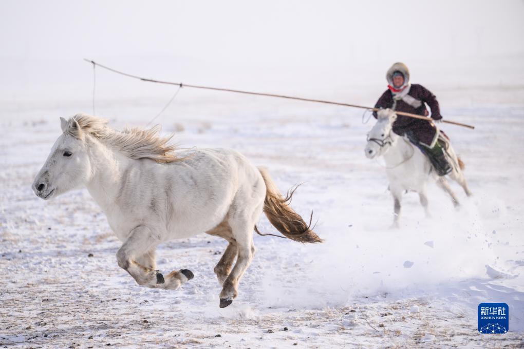 12月20日,內蒙古錫林郭勒盟西烏珠穆沁旗的牧民在雪原上馴馬。