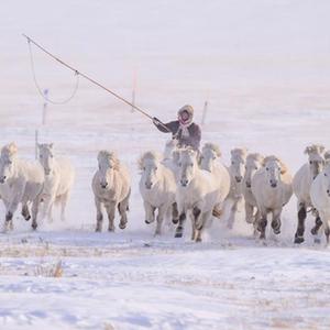 時下,內蒙古錫林郭勒盟西烏珠穆沁旗的草原銀裝素裹。當地牧民趕着馬匹來到雪原上進行馴馬表演,呈現了雪原奔馬的壯觀景象。