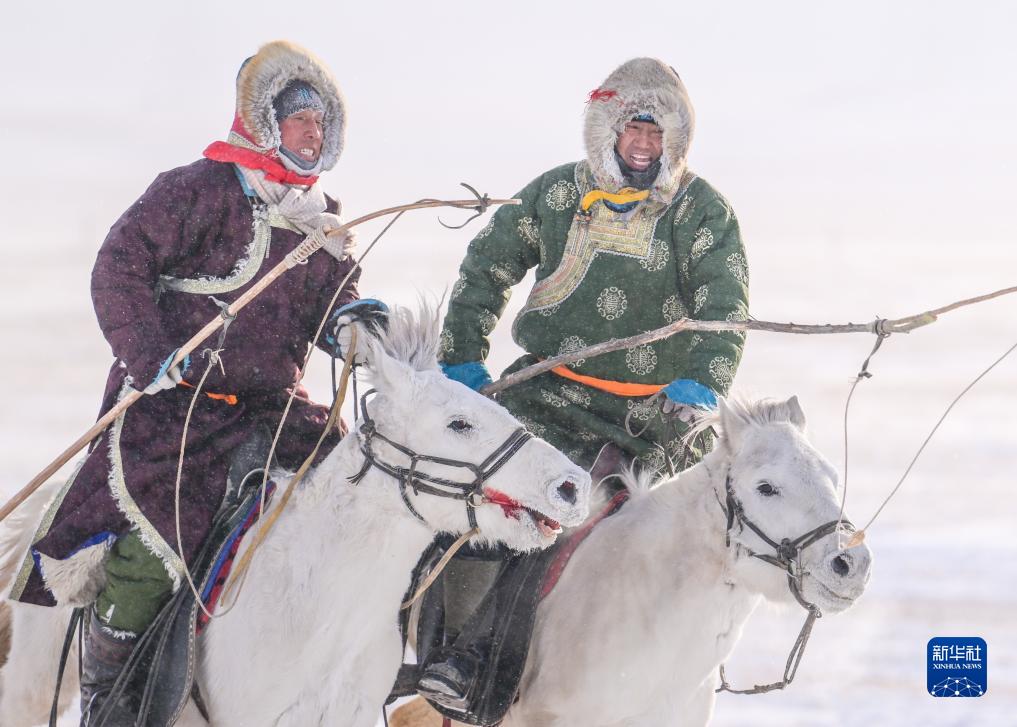 12月20日,內蒙古錫林郭勒盟西烏珠穆沁旗的牧民在雪原上馴馬。