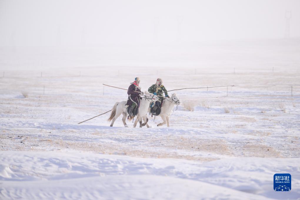 12月20日,內蒙古錫林郭勒盟西烏珠穆沁旗的牧民在雪原上準備馴馬。