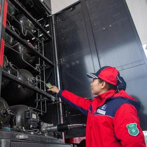 12月20日,在位於重慶市長壽區的供氫中心內,工作人員在為氫燃料物流重卡加氫。