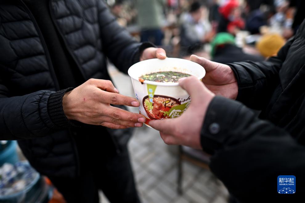 12月20日,在青海省民和縣官亭鎮,當地群眾接過拉麵。