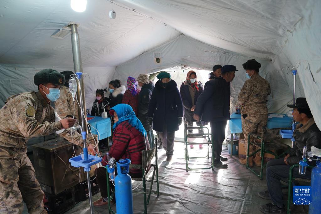 12月20日,陸軍第76集團軍某旅官兵在積石山縣石垣鎮安置點為受災群眾提供醫療服務。