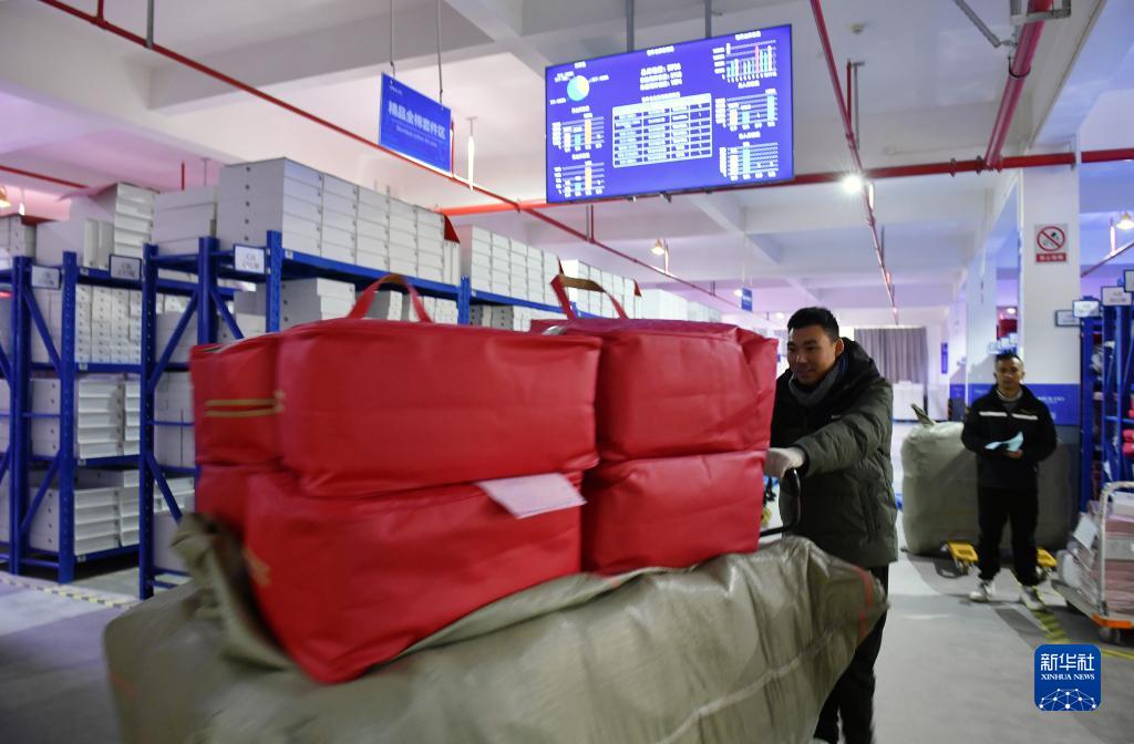 12月20日,在江蘇南通海門區三星鎮江蘇美羅家用紡織品有限公司倉庫,工人在運輸包裝好的家紡産品。