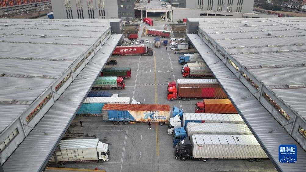 12月20日,物流車輛在江蘇南通海門區三星鎮深國際·疊石橋現代國際物流園等待裝運銷往全國各地的家紡産品(無人機照片)。