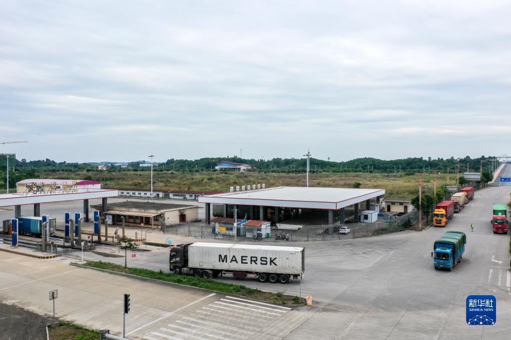 12月20日,在廣西東興口岸,貨車排隊入關(無人機照片)。