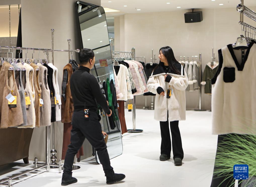 12月20日,在遼寧省遼陽市佟二堡鎮的一處商場,顧客在試穿皮草服飾。