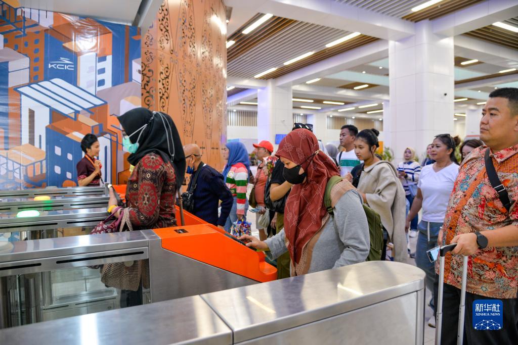 11月17日,在印度尼西亞雅加達的哈利姆站候車大廳,人們刷票進站。當日,雅萬高鐵開通運營“滿月”。