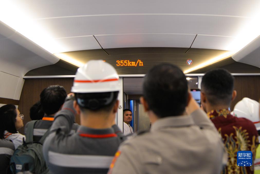 6月22日,在印度尼西亞雅萬高鐵進行聯調聯試的綜合檢測列車上,記者和工作人員拍攝顯示列車時速超過350公里的電子屏。