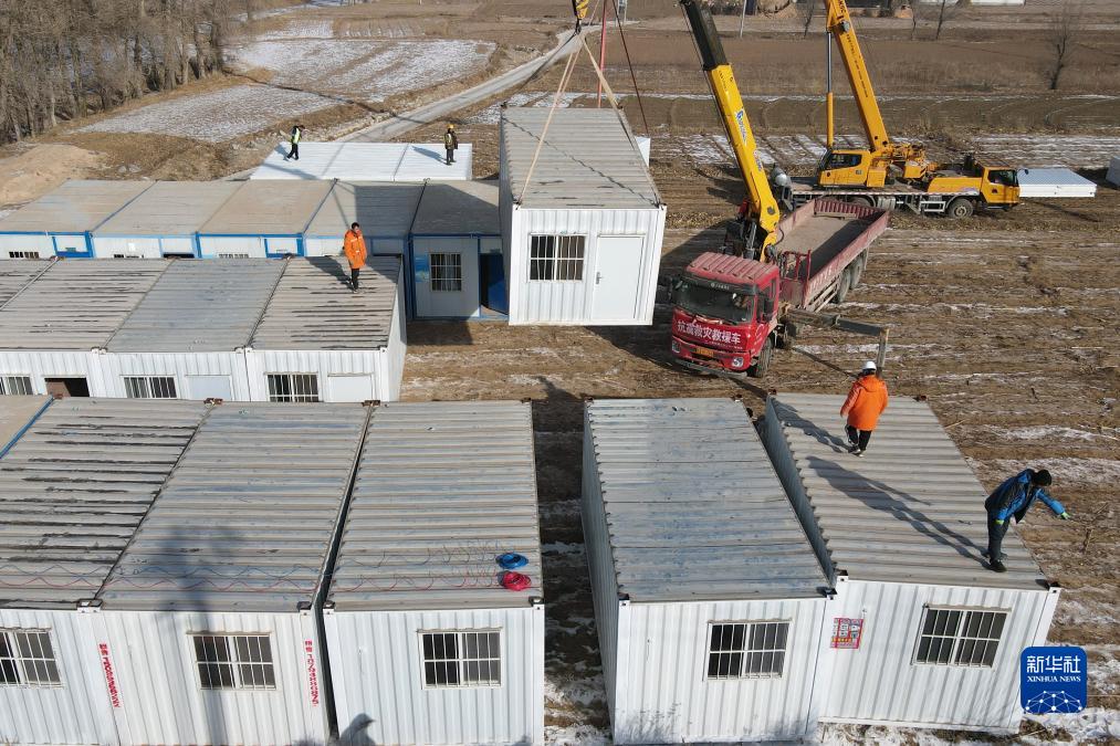 12月21日,在積石山縣大河家鎮梅坡村,施工人員搭建活動板房(無人機照片)。