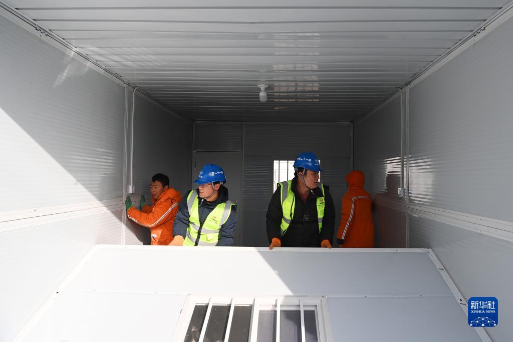 12月21日,在積石山縣大河家鎮梅坡村,施工人員搭建活動板房。