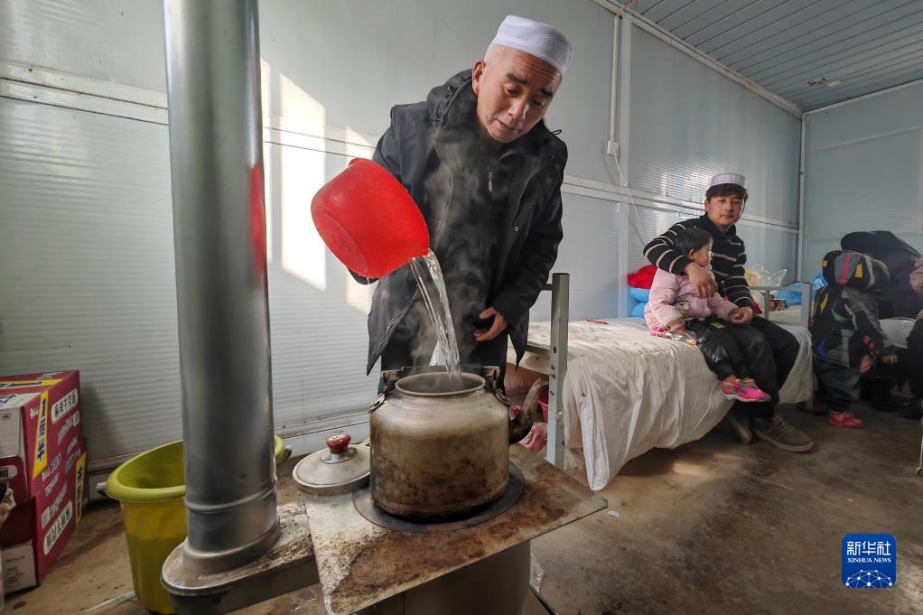 12月21日,在積石山縣大河家鎮梅坡村活動板房安置點,受災群眾在活動板房內的火爐上燒水。