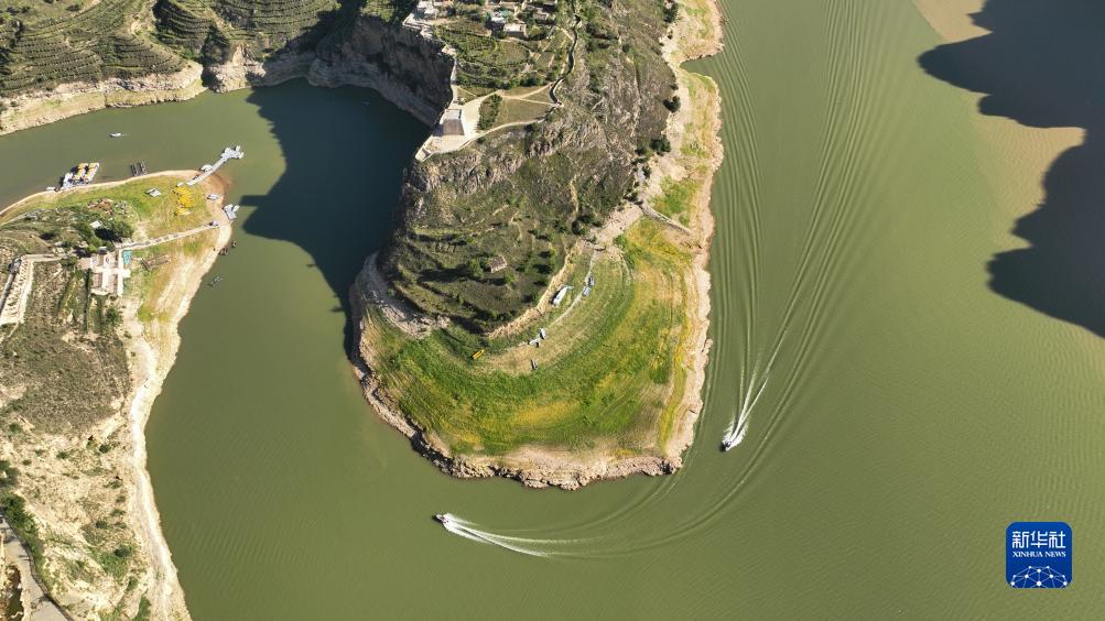 8月24日,游客在黃河老牛灣乘快艇游玩(無人機照片)。