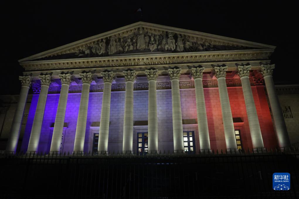 這是12月19日在巴黎拍攝的被紅白藍三色綵燈點亮的法國國民議會。