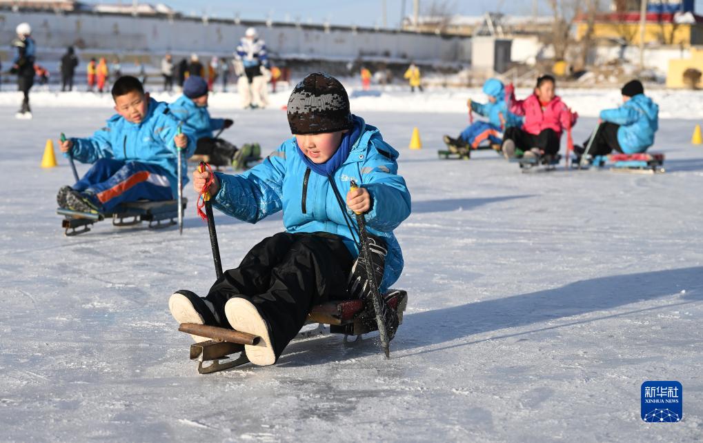 烏魯木齊縣水西溝中學一年級學生在校園內的冰場上體驗冰爬犁(12月20日攝)。