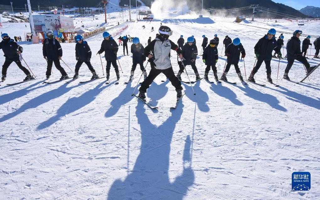 烏魯木齊縣廟爾溝中學學生在該縣絲綢之路山地度假區滑雪場上滑雪課(12月19日攝)。
