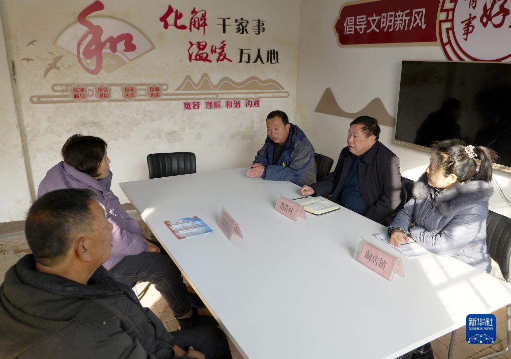 12月20日,在寶豐縣鬧店鎮范營村“擺理堂”,村鎮幹部(右)為村民進行信訪調解。