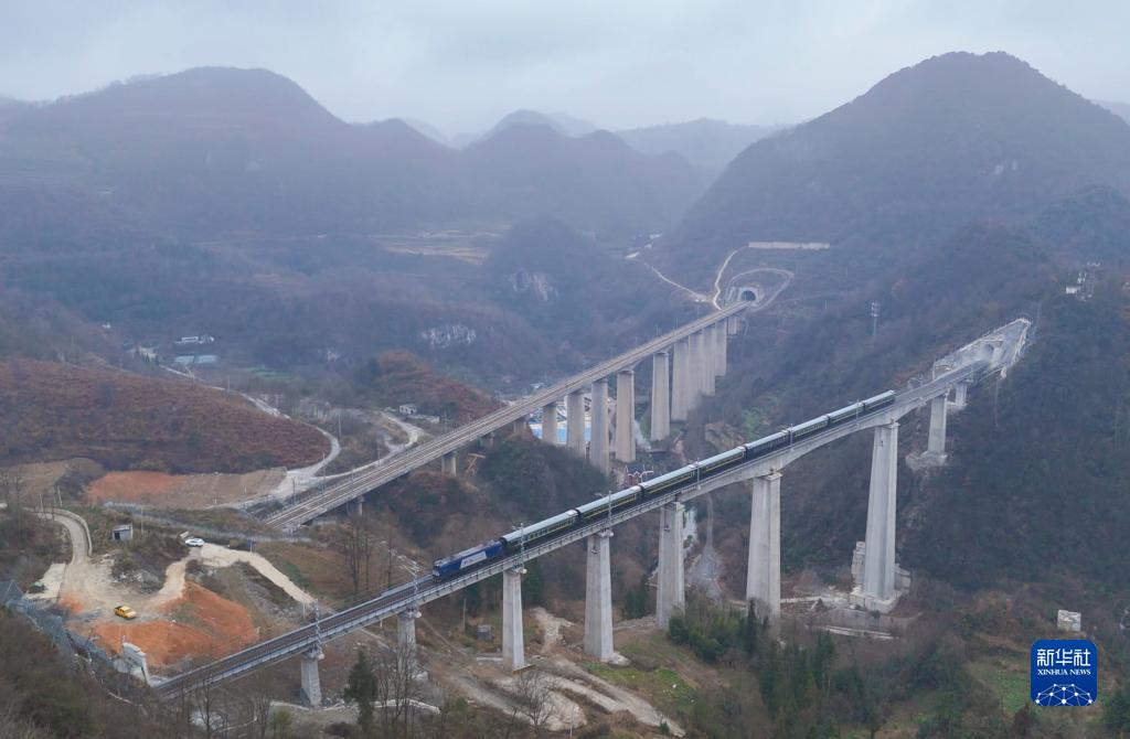 12月21日,K9391/9394次列車經過位於畢節市七星關區的小河特大橋(無人機照片)。