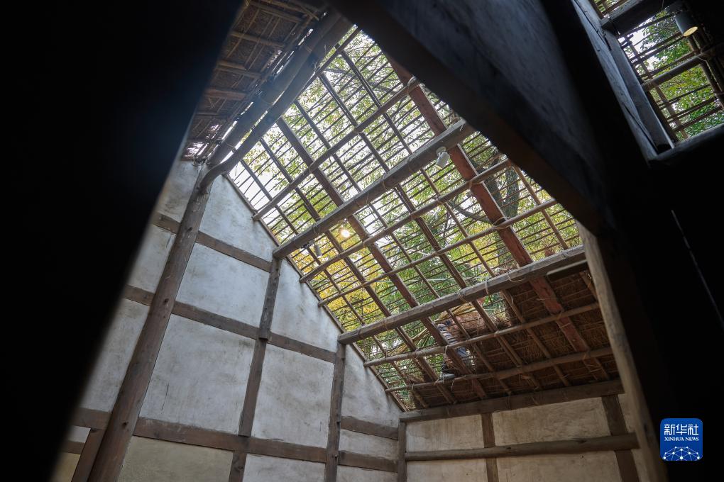這是12月19日在成都杜甫草堂茅屋故居拍攝的拆除了舊茅草後的屋頂。