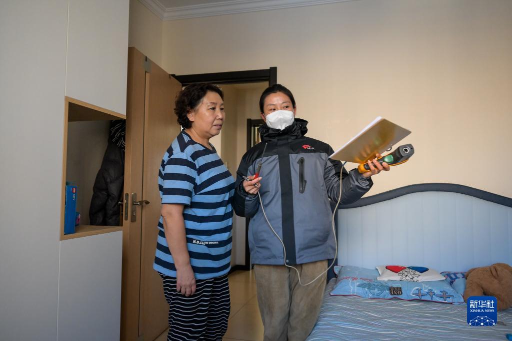 12月21日,呼和浩特市城發供熱有限責任公司橋靠分公司工作人員(右)在玉錦軒小區一戶居民家測溫。