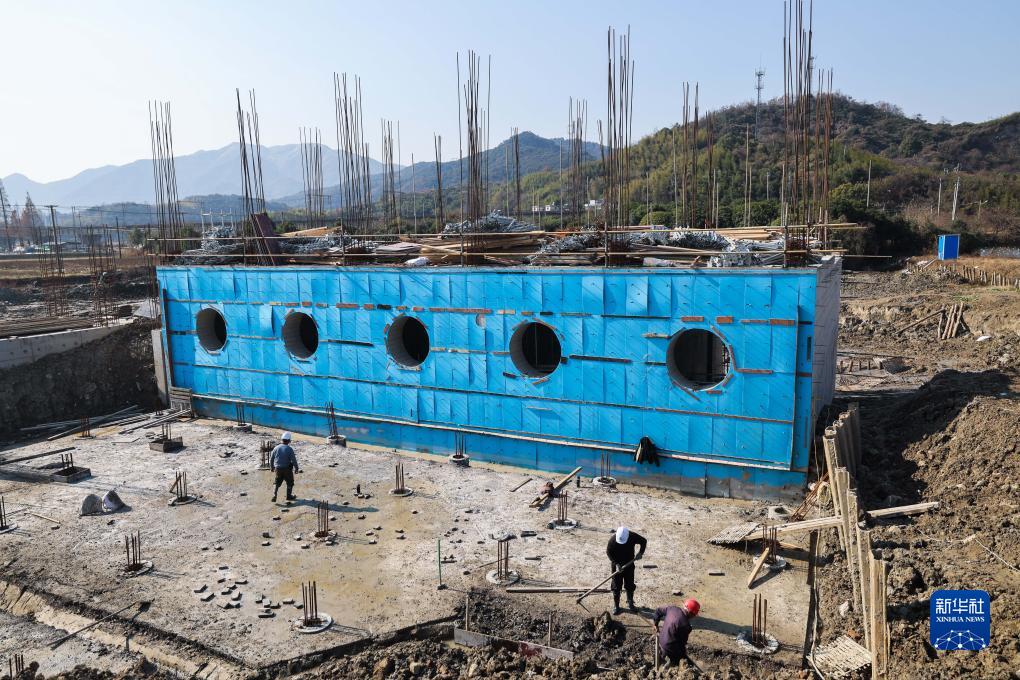 12月21日,諸暨市店口鎮浦陽江畔的江西湖電排站改建工程正在實施主體泵房基礎及自排箱涵主體建設。