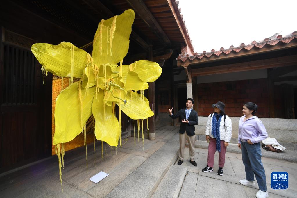 12月19日,福建晉江梧林村閩南古民居德鑨三間張內,梧林藝術季策展人、歸僑後代吳少鵬(左)向游客介紹他的裝置藝術作品。