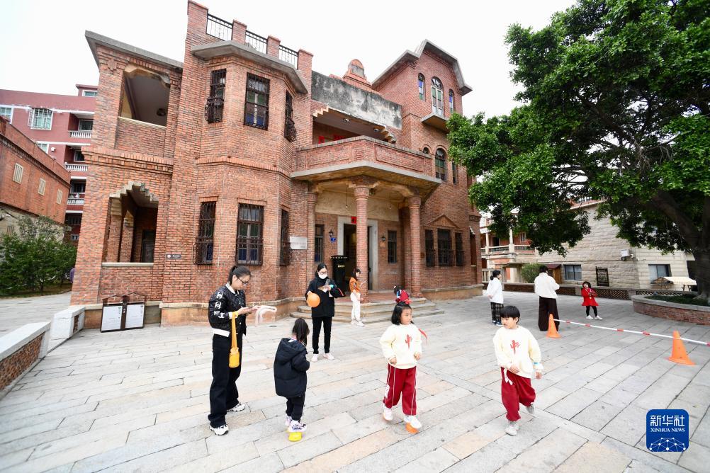 12月19日,福建晉江梧林村華僑歷史建築僑批館前,小朋友參加學校組織的游樂活動。梧林僑批館於1938年建成,是一幢哥特式建築。